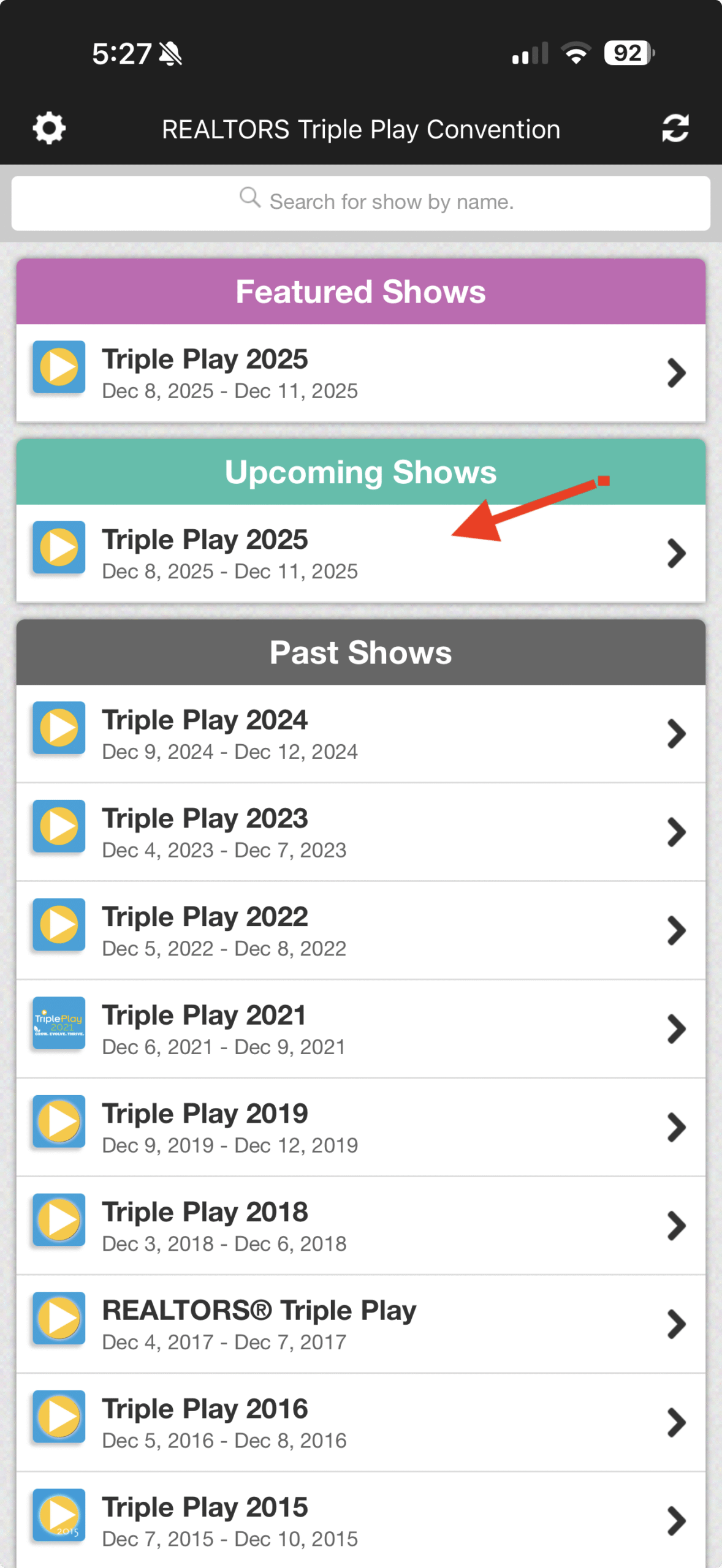 If you’re still seeing information for a prior year’s convention you will need to install the 2025 Show in your Triple Play App.